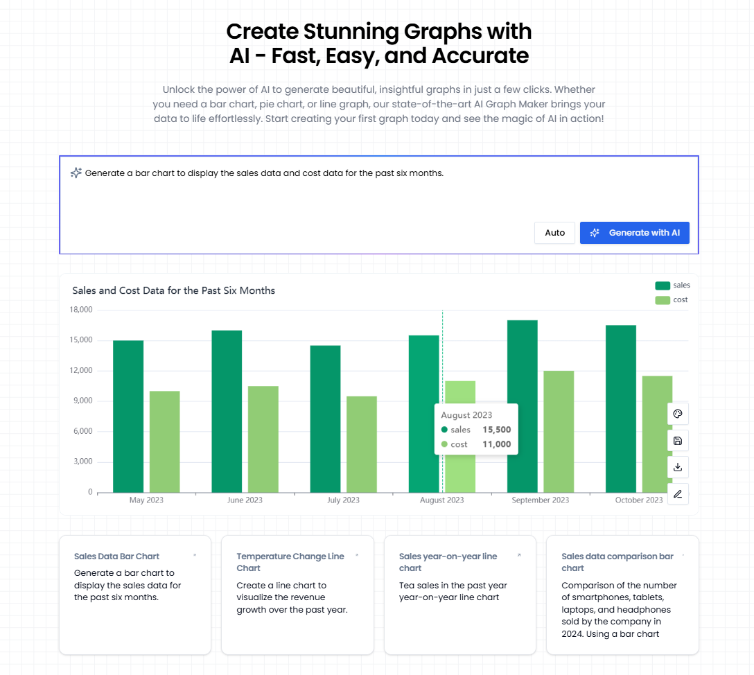 AIGraphMaker.net is an ai graph generator, which can build echarts-based interactive and customizable charts, and mermaid interactive charts.