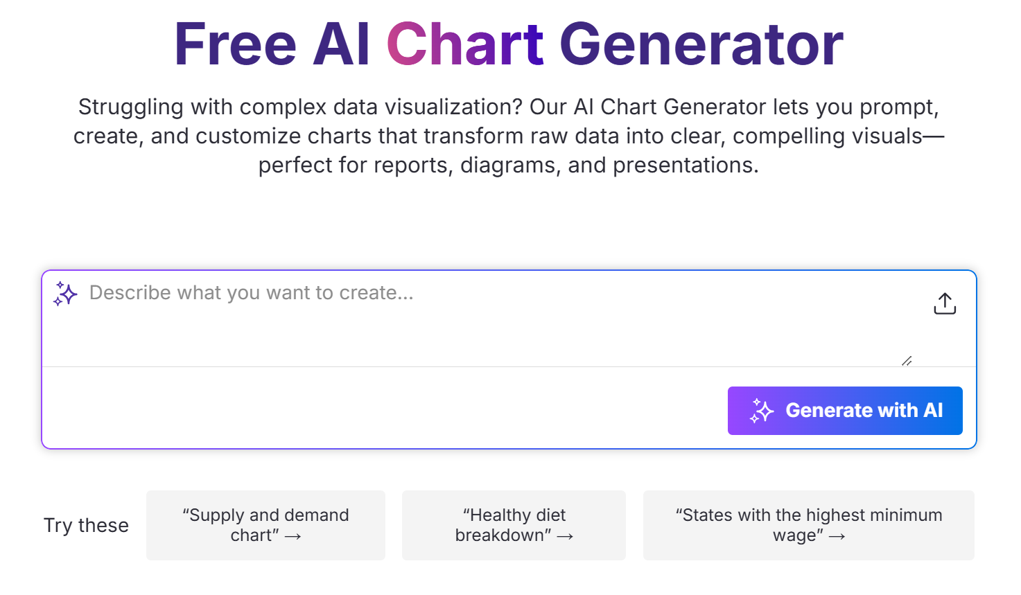 AI chart generators have revolutionized data visualization by enabling users to create professional charts, which can leverage artificial intelligence to simplify the process of creating charts and graphs. These tools can take raw data or a natural language description of the desired visualization and automatically generate customizable charts.