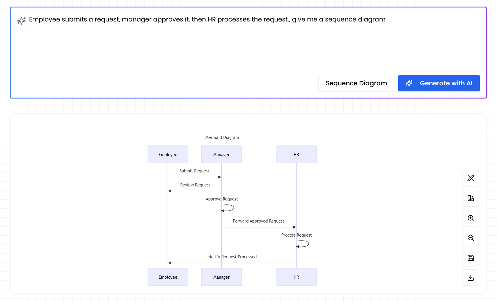 - Generate Diagram: The tool generates the corresponding Mermaid code for your sequence diagram or other interaction charts.