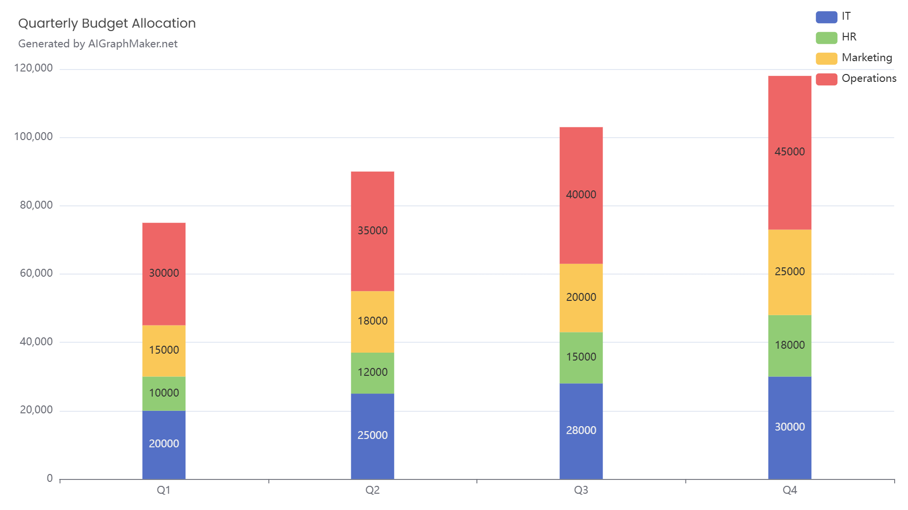Create a stacked bar chart displaying budget allocation for each department over four quarters. Each bar should represent a quarter, and the stacks should show the budget for IT, HR, Marketing, and Operations. Add axis labels, a legend, and a title: 'Quarterly Budget Allocation'.