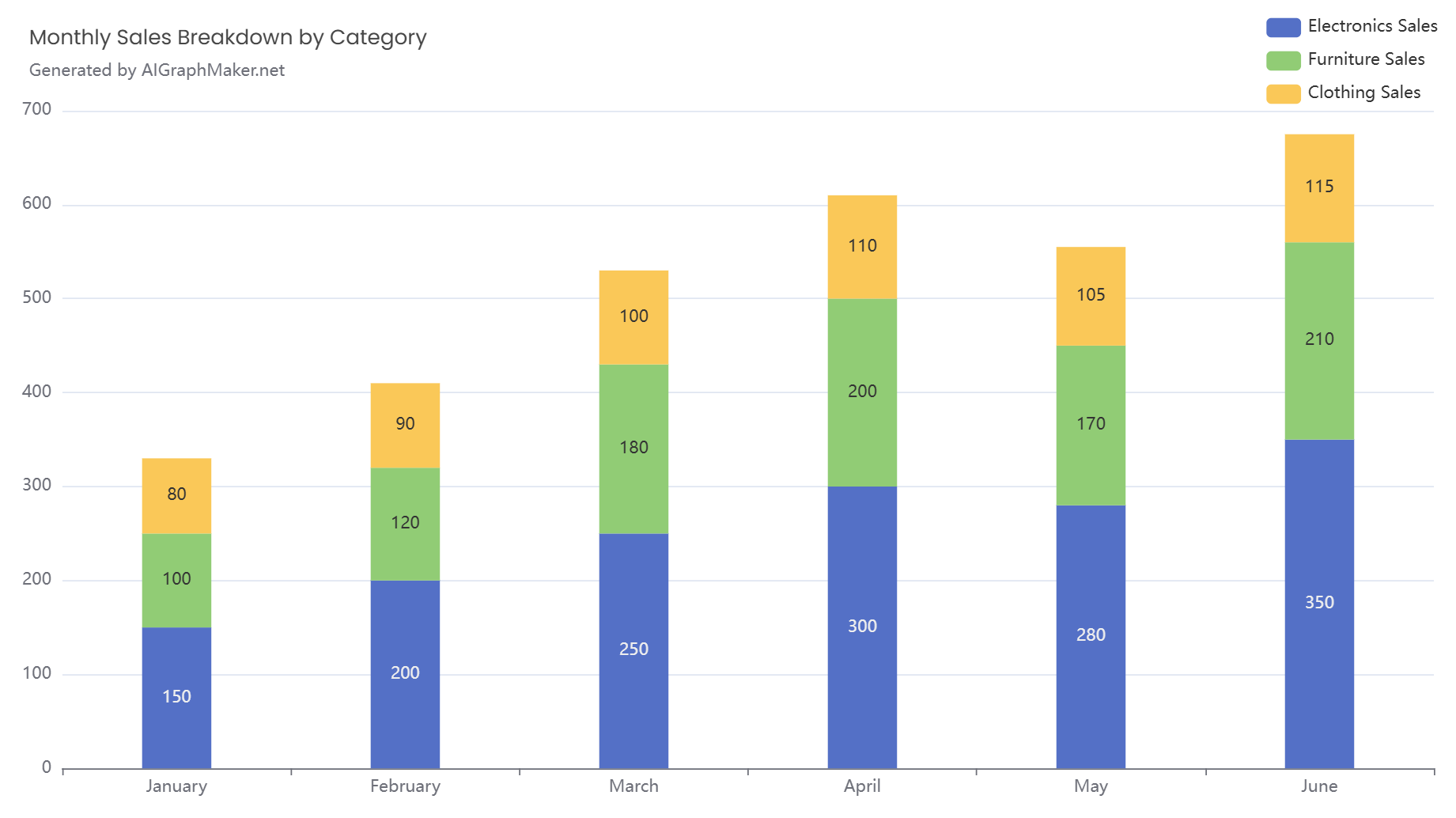 Clothing Sales: 80, 90, 100, 110, 105, 115and finally, you will get a stacked barchart in AIGraphMaker generator like this:
